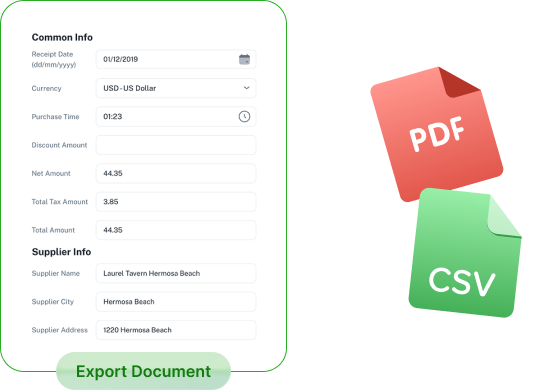- Upload up to 50 docs at once and export key data to CSV
